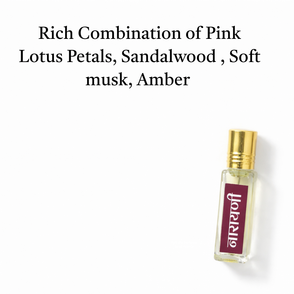 Inspired by the sacred presence of Kolhapur Ambabai (Mahalakshmi), Narayani Attar is a soulful blend of pink lotus petals, sandalwood, soft musk, and amber — capturing the purity, strength, and divine femininity of the goddess. It opens with the delicate freshness of pink lotus, soft, serene, and gently uplifting.